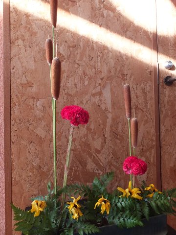 ケイトウとガマ、夏の花たち、艸舎のロビー涼やかな空気が流れています。季節のお花を活けてくださるのは、正専池坊 泰仙先生。